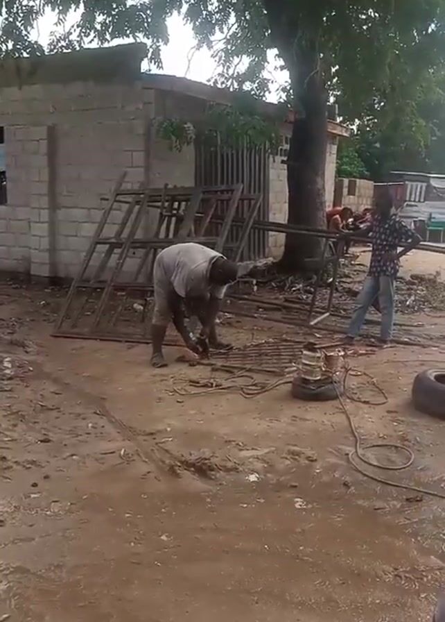 The scene depicts an outdoor workspace where a man in a light-colored shirt and shorts is actively engaged in cutting metal with a handheld power tool, generating sparks. Beside him on the muddy ground, a welding machine sits with its cables extended. A collection of fabricated metal frames is leaned against the backdrop of a partially constructed building made of cinder blocks. To the right, another individual wearing a patterned shirt and jeans is standing. A large tree provides shade over the scene.