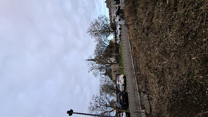 A vertical shot shows a street scene with a church steeple poking above the trees. Several cars are parked along the street. Brown vegetation lines the right side of the street. The sky is overcast and grey. A lamppost is visible in the lower-left corner. The scene is slightly tilted.
