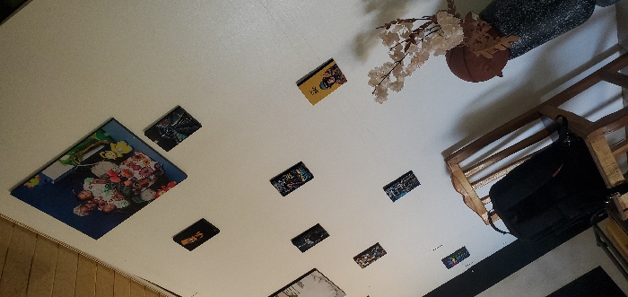 The image depicts an interior room within a building in Jos, Nigeria, captured from an upward-angled perspective. The environment features white-painted walls. A large, framed photograph of a family group, including adults and children in patterned clothing, is prominently displayed on the upper left wall. Surrounding this large frame, and extending across the wall, are multiple smaller, rectangular framed pictures featuring various illustrations, including pop culture characters. In the lower right foreground, a light-colored wooden chair is positioned with a black backpack resting on its seat. To the right of the chair, a dark, textured vase holds artificial light-colored floral blossoms and brown leaves. A reddish-brown, round, dish-like object is situated atop the vase, partially obscured by the foliage. A section of a wooden ceiling or beam structure is visible in the upper left corner. A vertical black strip is present on the far left wall.