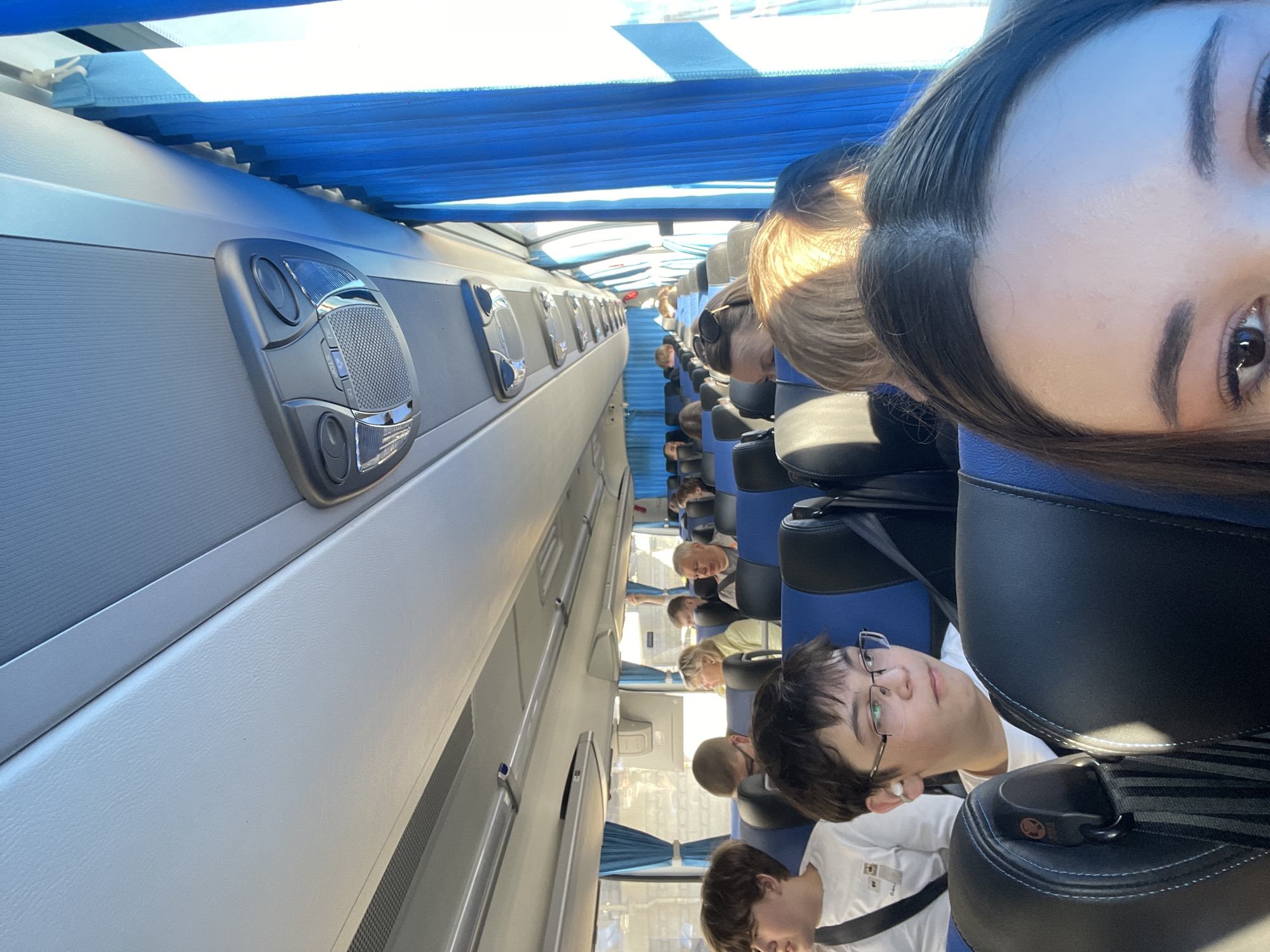 Inside a bus-like vehicle, rows of passengers are seated in blue seats