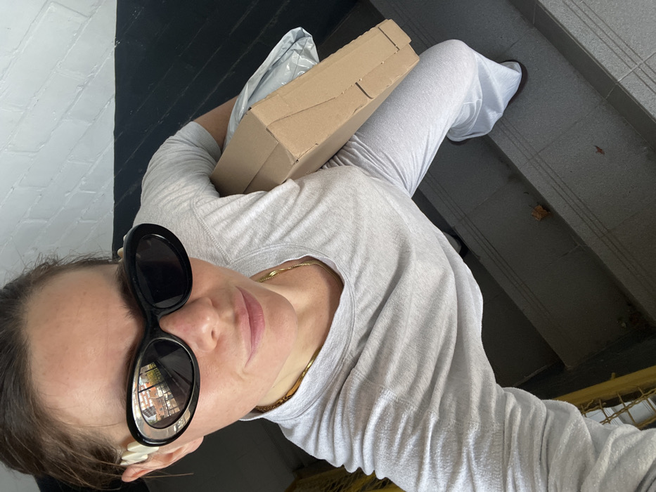 A female individual is depicted in an outdoor setting on a concrete staircase in Roubaix, France. She wears black oval sunglasses with white temple accents, reflecting a multi-story brick building facade and sky. Her attire consists of a plain light grey long-sleeved top, a thin gold-toned chain necklace, and light grey relaxed-fit trousers. She carries a rectangular brown cardboard box and a white plastic package under her right arm. Dark-colored flat shoes are visible on the steps. The staircase is dark grey, featuring anti-slip ridges, and exhibits minimal leaf debris. A white painted brick wall surmounts a dark, horizontal railing in the upper right background, with a yellow grid structure partially visible to the far left. The individual is looking directly towards the camera.