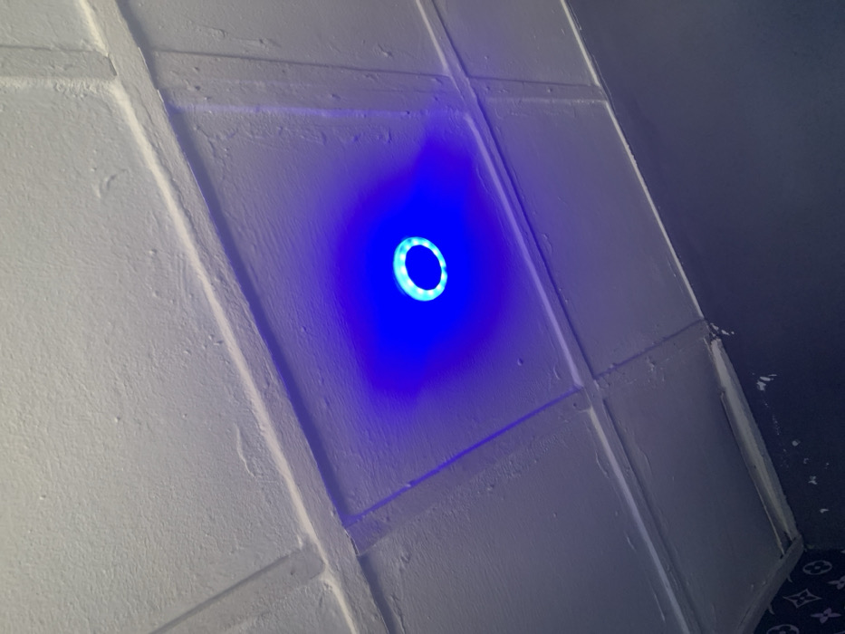 An upward-angled view captures a section of a white paneled ceiling inside a structure in Bwari, Nigeria. Centrally positioned within the frame is a circular light fixture emitting a vibrant blue light, creating a distinct blue halo effect on the surrounding white ceiling panels. The ceiling features discernible grid lines, indicating individual panels or tiles, some of which exhibit minor irregularities in texture or finish. In the lower left quadrant, a portion of a dark-colored wall is visible, displaying a repeating pattern reminiscent of the Louis Vuitton monogram. No individuals, specific actions, or interactions are depicted.