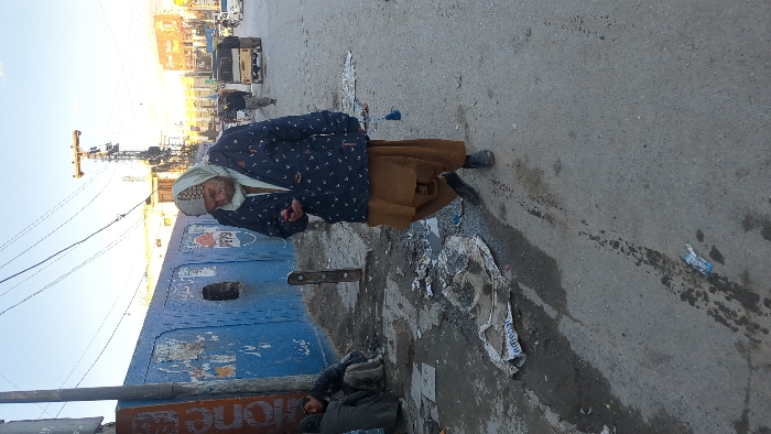 An elderly person in a patterned jacket and brown skirt walks along a street. They have a head covering and dark shoes. A wall borders the street, marred by peeling paint, an advertisement, and a metal post. Trash and debris are scattered on the ground. In the distance, buildings and power lines are visible under a bright sky.