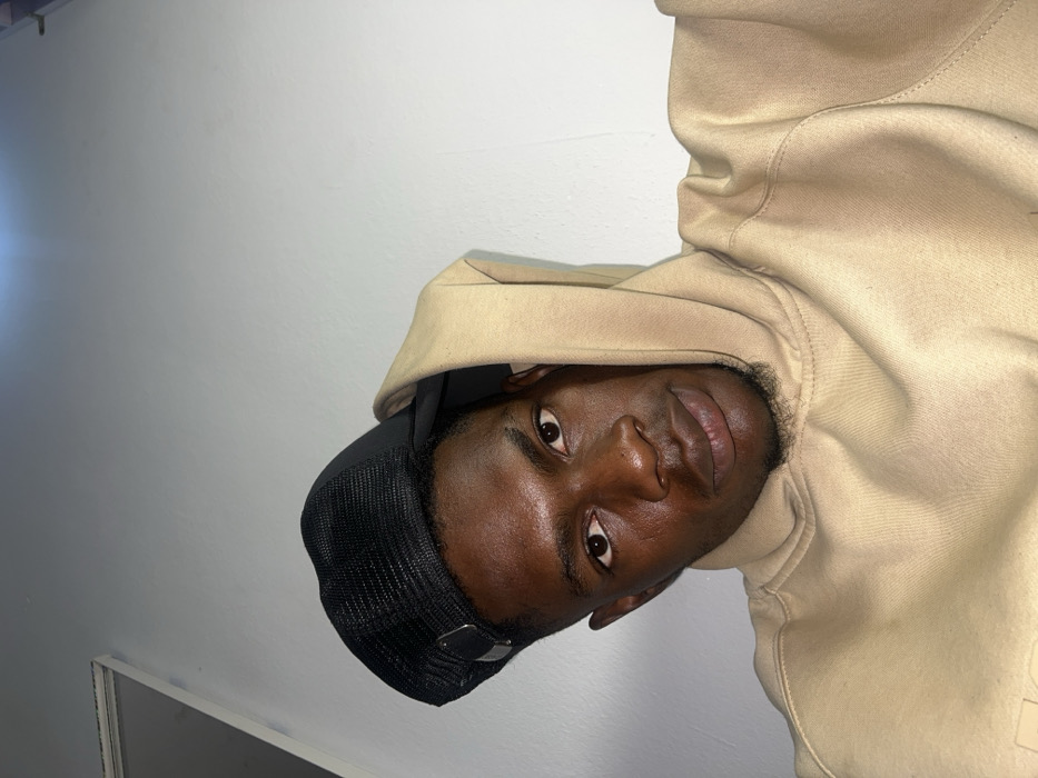 A man poses in a beige hoodie and black baseball cap. The lighting is bright, emphasizing his dark skin. He gazes into the camera with a slight smile. His cap has a metal buckle. The background is a plain white wall, a mirror can be seen on the bottom left of the image.