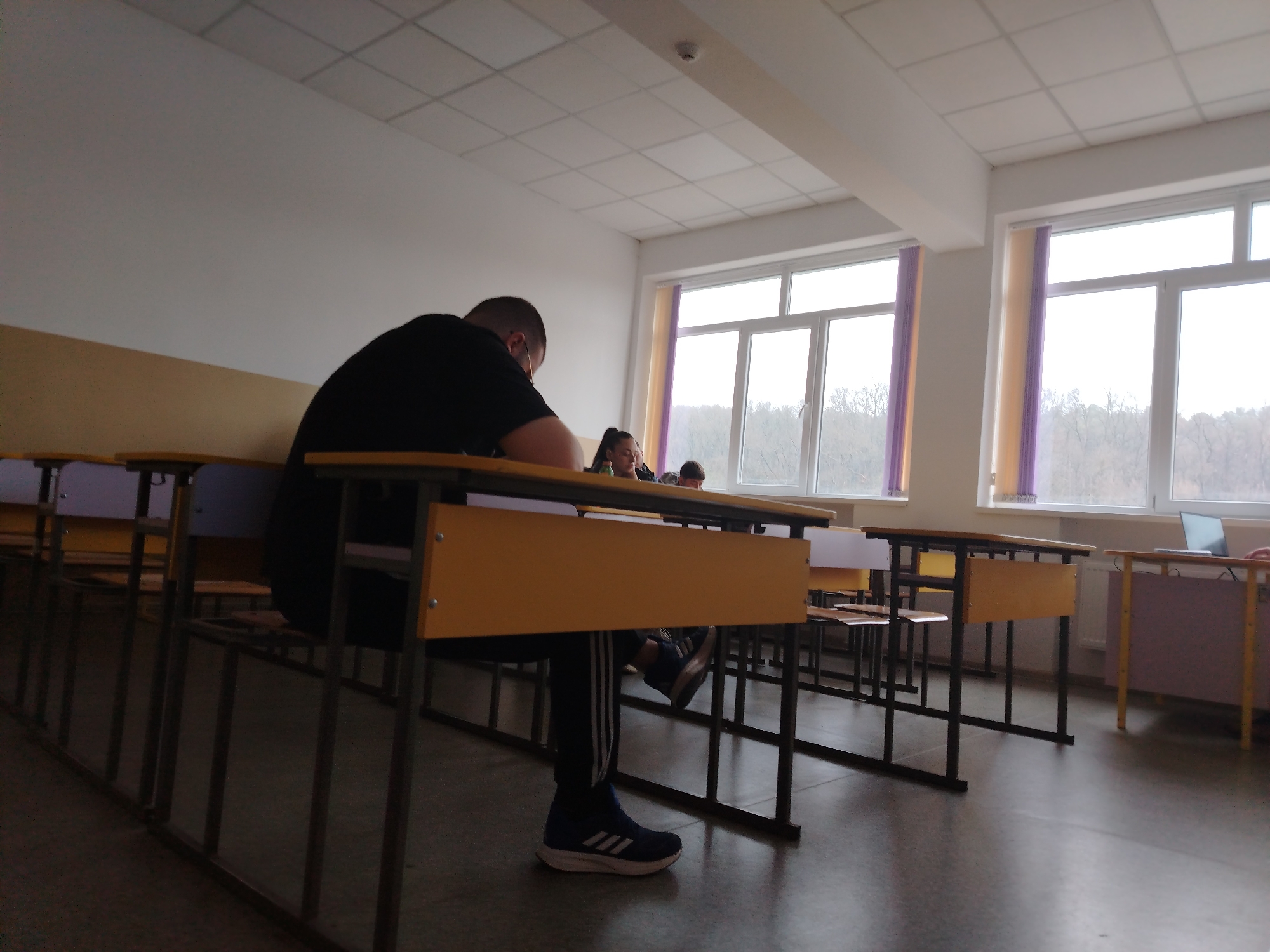 The image depicts the interior of a classroom or lecture hall located in Targovishte, Bulgaria. The room features white walls with a light brown/beige wainscoting-like section along the lower part of the left wall. The ceiling is a white drop ceiling with square panels, incorporating a visible smoke detector centrally. The floor is dark and reflective, possibly linoleum or polished concrete. Large, multi-pane white-framed windows occupy the right wall, providing natural light and a view of bare trees, suggesting an outdoor wooded area. Vertical blinds in purple and light yellow/beige are partially drawn over the windows. Radiators are positioned beneath the windows. The room is furnished with multiple student desks and chairs arranged in rows. The desks have light yellow/brown wooden tops and dark metal frames. The chairs feature dark frames with what appear to be purple seats and backrests. A larger desk, possibly a teacher's desk, with a purple modesty panel and yellow trim, is visible on the far right, where an open laptop is present. In the foreground, a male individual is seated at a desk, viewed from behind. He has short hair and is wearing a black t-shirt, dark athletic pants with white stripes on the side (Adidas branding visible), and dark blue Adidas sneakers with white soles. He appears to be focused downwards on his desk, with his right arm resting on the surface. In the mid-ground, at least two other individuals are partially visible, also seated at desks. One individual with dark hair tied back, wearing a dark top, is seated to the right of the foreground subject. Another person's head is visible further back. A person's hand is visible on the desk with the laptop in the far right. All individuals are seated, suggesting participation in a classroom activity.
