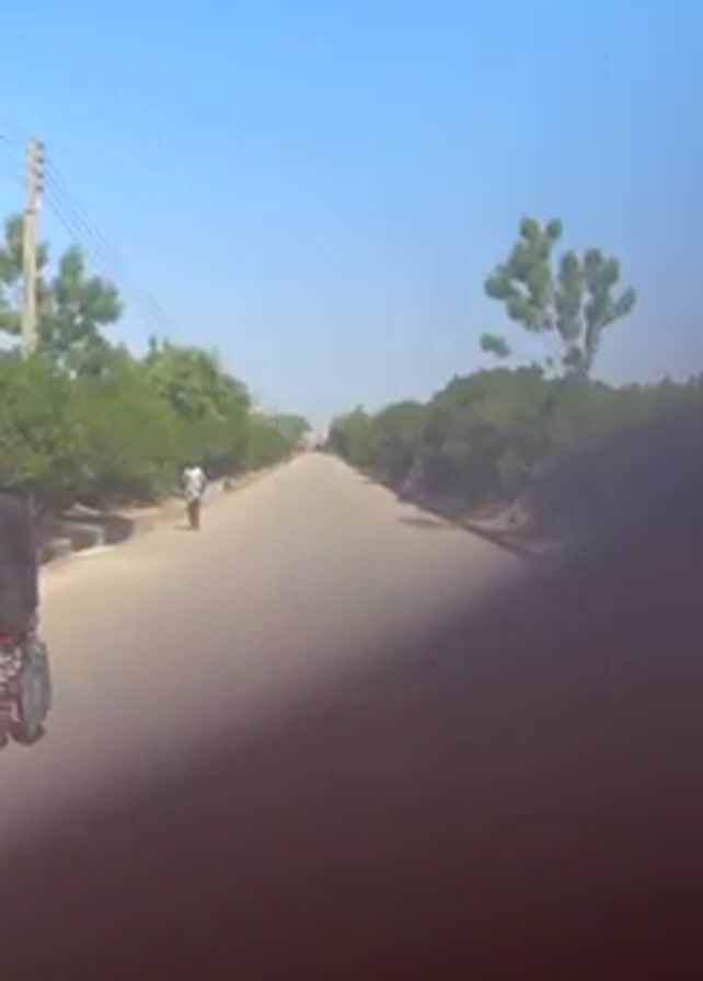 A straight, paved road stretches into the distance under a clear blue sky. The road is bordered by low-lying greenery and small trees. A utility pole stands on the left side of the road, with wires running along it. A person wearing a white shirt is riding a bicycle down the road, moving away from the camera. The foreground of the video is obscured by a dark shadow.