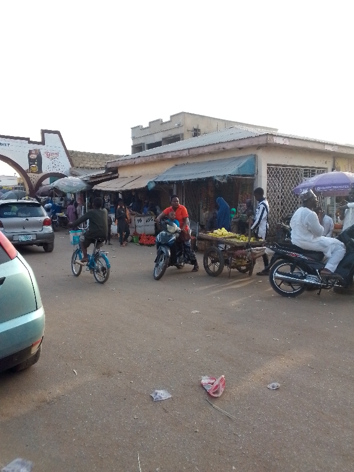 A busy street scene depicts a local market. People mill about, some on motorbikes, bicycles, and on foot. Cars are parked along the roadside. Market stalls line the street, sheltered by awnings and umbrellas. Goods, including fruit and vegetables, are displayed. The market entrance is marked by an archway displaying advertisements. The buildings are simple, with some under construction. Trash litters the street, adding to the scene's realism.