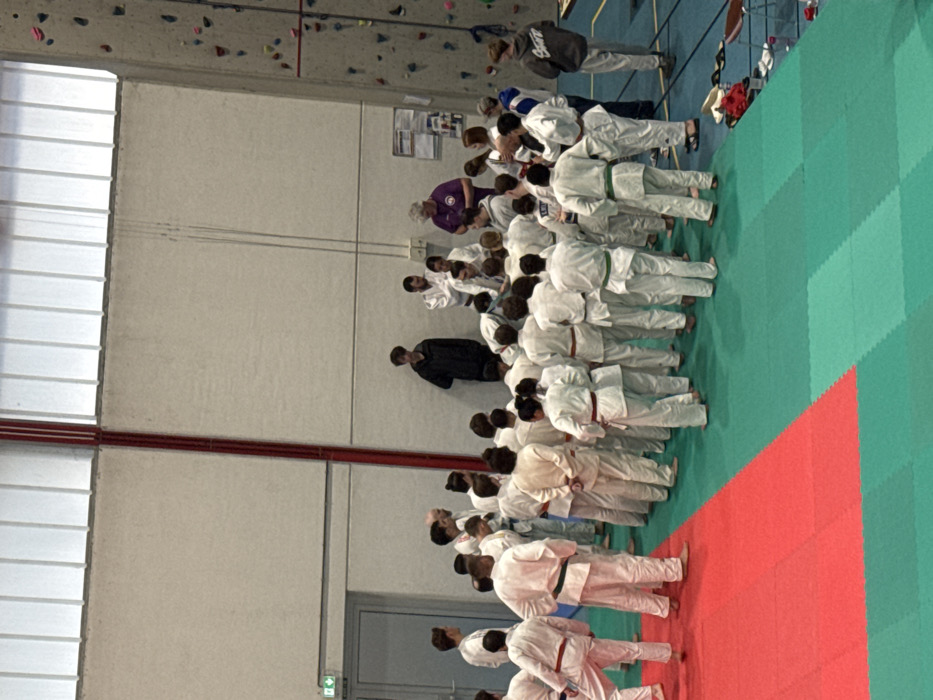 The image captures an indoor sports facility in Brumath, France, featuring light grey walls and high translucent panel windows along the top. A prominent red vertical structural beam is visible on the left. The floor consists of interlocking martial arts mats, with a large red section in the foreground leading into a predominantly green area where the activity is concentrated. On the far right, a rock climbing wall with assorted colored handholds is present. Approximately 30 to 40 individuals are visible, primarily adolescents and young adults, with a few older adults. The majority are dressed in white martial arts gis (uniforms), many displaying colored belts, including red and green. This group is loosely gathered on the green mats, generally oriented towards the center-right of the frame. Several individuals within this central area appear to be adults, including one older male in a purple short-sleeved shirt and another bald male in a white gi, who are engaged with what appears to be a sheet of paper or a clipboard, suggesting a briefing or instruction session. On the left side, slightly apart from the main group, a young male in a black hoodie and dark pants stands observing. To the far right, another young male in a grey hoodie stands near the edge of the mat area, where personal items such as footwear and water bottles are visible on the floor next to the rock climbing wall. A grey door with a green exit sign is located on the upper left wall. Cables run vertically down the right wall near the climbing structure, and a bulletin board or posters are affixed to the wall below. The scene depicts a gathering for a martial arts class or event.