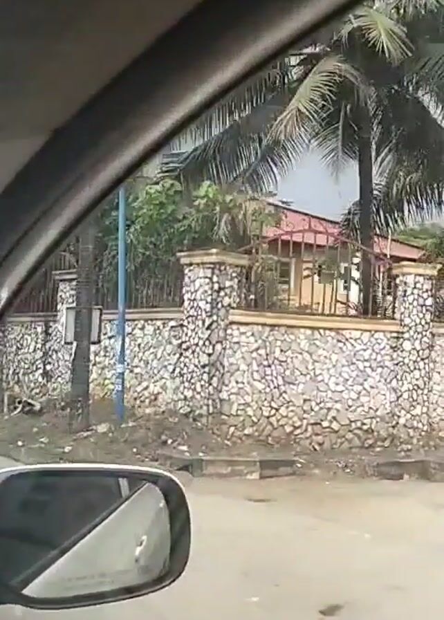 car moving slowly down a paved road in what appears to be a residential neighborhood. The houses and buildings along the road are surrounded by walls, some made of stacked stones. Palm trees and other vegetation are visible. The sky is overcast.