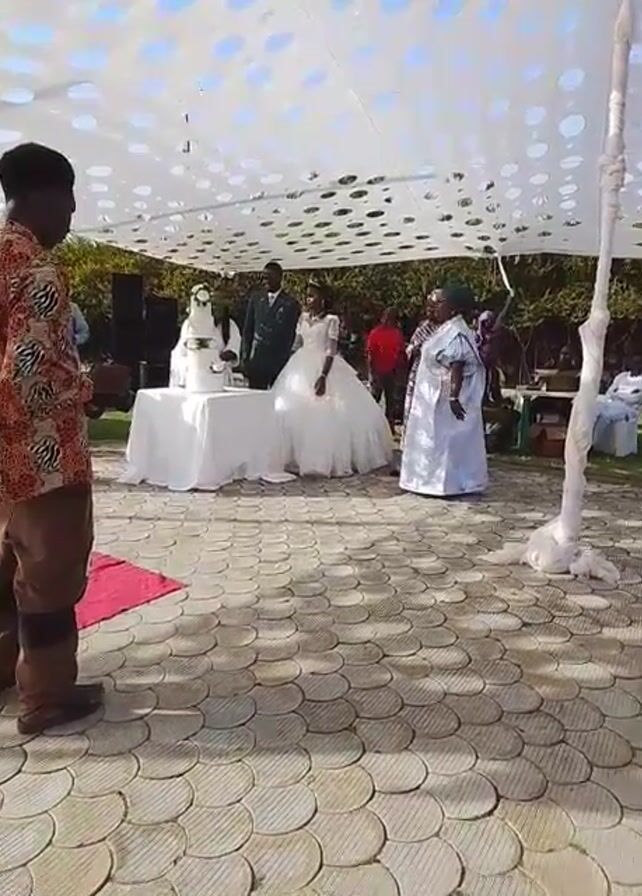 wedding ceremony in an outdoor setting. The bride and groom are standing behind a table with a two-tiered wedding cake. A woman in a white dress is standing near the couple. A man in an orange patterned shirt and brown pants is standing in the foreground. The scene is under a white canopy with polka dots. The ground is paved with interlocking circular patterns. A red rug is visible in the foreground. There is a white decorative tree trunk to the right. Other guests are present. Music is playing.