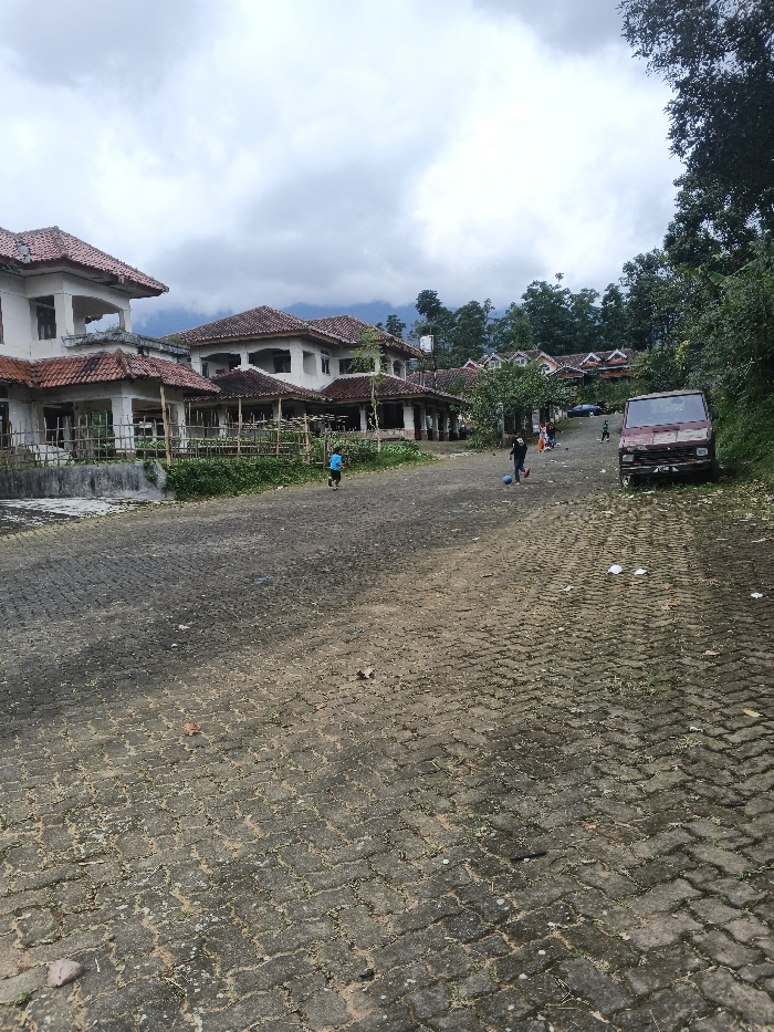 The image captures an outdoor scene in Saisetha, Laos, under an overcast sky. A wide, dark grey interlocking paver road, exhibiting signs of wear, dirt, and scattered debris including leaves and white paper fragments, extends from the foreground into the middle ground. On the left side of the road, a series of multi-story buildings with light-colored exteriors and distinct red-orange tiled roofs are visible. The closest structure features an open lower level with support pillars and a rustic wooden fence. Further along, similar architectural styles are repeated, some appearing aged or in various stages of construction/renovation, blending into a more distant cluster of buildings on a gentle incline. A basketball hoop is faintly visible mounted near the roofline of one mid-ground building. Several individuals, predominantly children, are present on the road in the middle ground. One child, wearing a bright blue shirt, is walking or running on the left. Toward the center-right, another individual, dressed in dark clothing, is actively engaged in kicking a dark-colored ball. Additional figures are discernible standing or moving further back near the buildings. On the far right, a dark red/maroon van, appearing weathered, is parked facing left, partially obscured by dense green foliage. Lush trees and bushes line the right side of the road and form a backdrop, with distant mountains faintly visible beneath the heavy cloud cover.