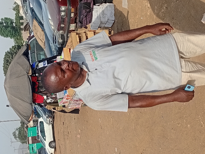 A middle-aged man stands outdoors, wearing a light gray polo shirt and beige pants, holding a small, cyan-colored device, likely a phone or remote. Behind him, a crowded marketplace or roadside scene unfolds with various vehicles, including cars and a white van, packed together. An open umbrella provides partial shade over a jumble of goods. The ground appears to be a dusty, earthy color.