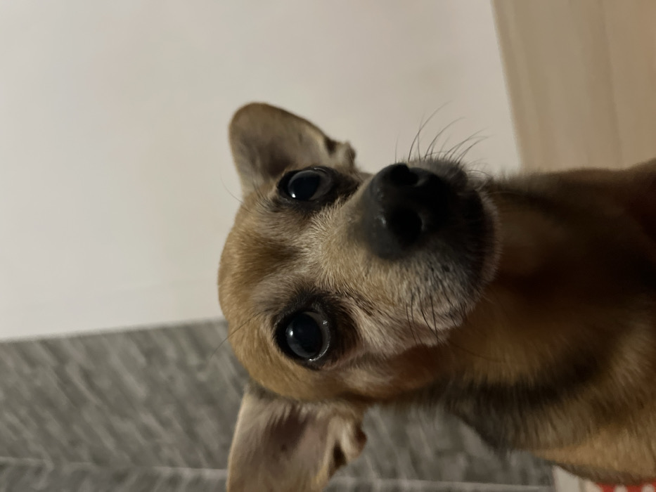 Location: An indoor setting within Sofia, Bulgaria. The image displays a close-up portrait of a small, short-haired dog, identifiable as a Chihuahua or similar small breed mix. The dog's fur is primarily reddish-brown and tan, with darker brown markings evident around the ears and down its back. Its large, dark, round eyes are prominent, gaze directly forward, and reflect a light source. The dog has a small, black, moist nose and short whiskers extending from its muzzle. Its ears are erect and triangular. The background consists of a textured, greyish surface on the left and a plain, light-colored wall on the right. The scene is illuminated by soft, diffused light. No other subjects or specific actions are discernible.