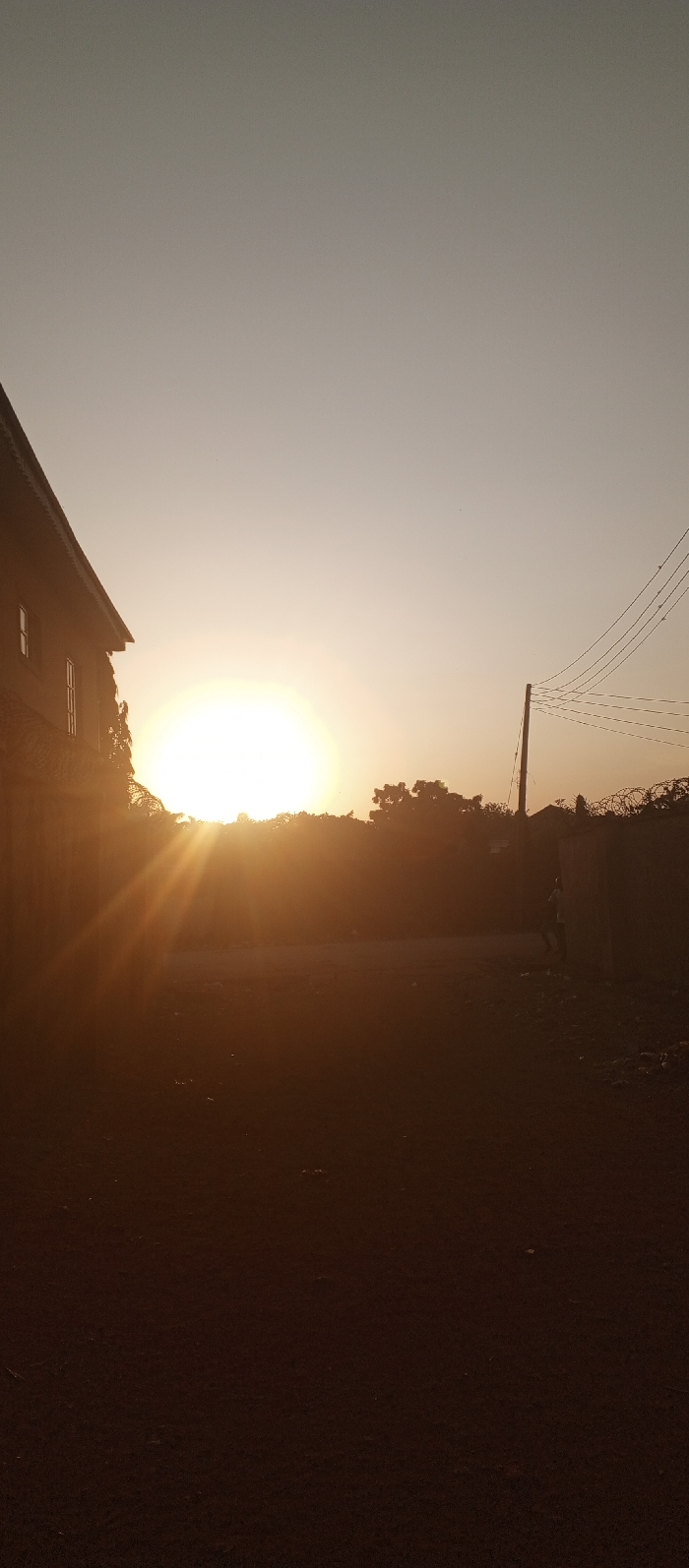 The image depicts a rural or semi-urban landscape in Unguwar Rimi, Nigeria, observed at either sunrise or sunset