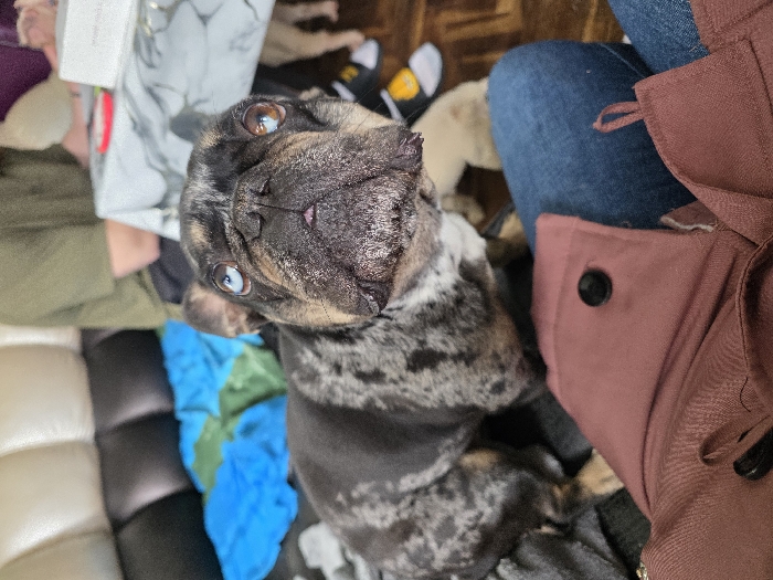 The image depicts an indoor scene in Dupnitsa, Bulgaria. A Merle French Bulldog with a dark and light mottled coat and heterochromia (one blue eye, one brown eye) stands in the foreground, facing upwards and slightly towards the viewer. Its small pink tongue is visible. The dog is positioned near the lower body of an individual, whose legs are visible wearing dark blue denim jeans and a reddish-brown garment featuring a black button. In the mid-ground, a person wearing an olive-green short-sleeved t-shirt is seated at a table. The table is covered with a grey and white marbled tablecloth and holds a white box and a small red object. Partially visible near the seated person's feet and the table is a second, lighter-colored dog and a black, white, and yellow sock or shoe. The background features a black sofa with a cream-colored backrest, upon which blue and green fabric items are resting. The flooring appears to be dark wood.