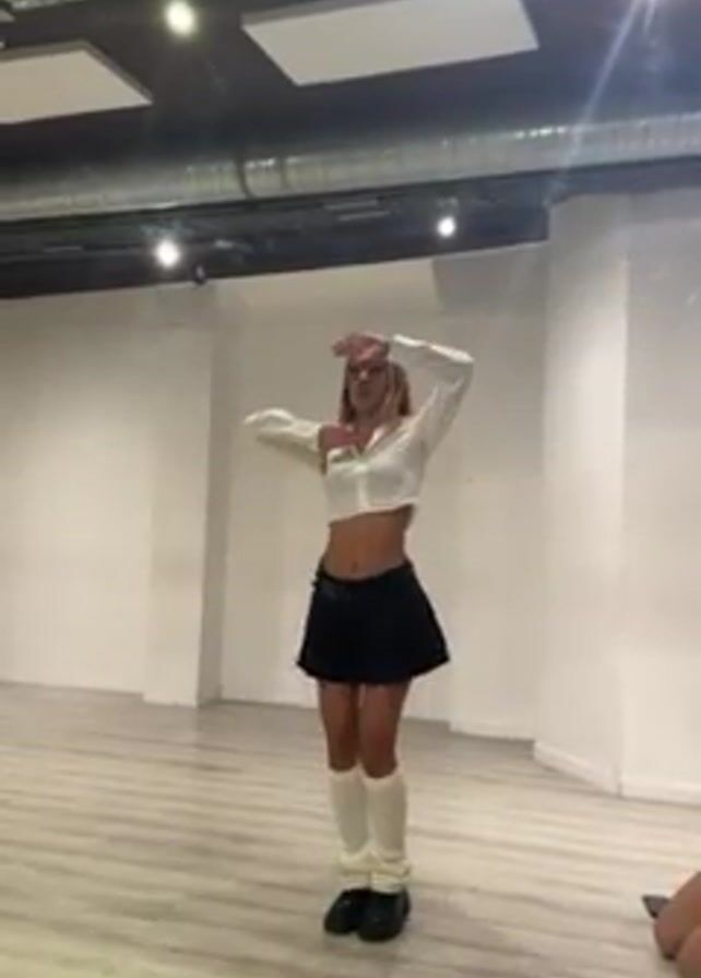 A young woman with light brown hair dances in a mirrored studio. She is wearing a white, long-sleeved crop top, a black miniskirt with a silver belt, white leg warmers, and black platform shoes. The studio is brightly lit, with a light grey wood floor and white walls. Overhead are exposed pipes and square acoustic panels. Someone is sitting on the floor to the right of the dancer, holding a phone and filming her. The woman’s movements are energetic and fluid, following the beat of the music. She appears confident and focused.