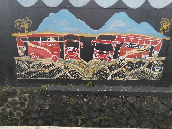 The image displays a mural painted on a dark wall, situated in Berger, Norway. The mural features two stylized red passenger buses, each bearing the text "Bli Trans" in gold and white script on its side. The left bus faces right, and the right bus faces left, creating a symmetrical arrangement. Behind the buses, two blue mountains and two yellow palm trees are depicted. Below the buses, intricate patterns representing terraced agricultural fields are painted in shades of brown and gold, with a small building or shelter visible within the right-side field pattern. The entire mural is outlined in white against a black background. The painted section sits atop a lower retaining wall constructed of dark, irregularly shaped stones, with sparse green vegetation growing along its base and within the stone gaps. No people or animals are present.