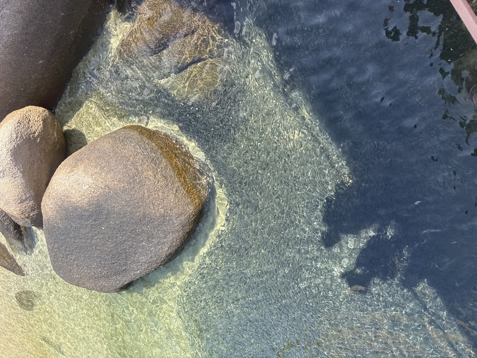This image presents an overhead view of clear, shallow coastal water in Ko Tao, Thailand, under bright sunlight. Multiple smooth, dark grey boulders are partially submerged, resting on a visible light-colored seabed. A dense school of numerous small, silvery fish occupies the central and lower-left areas of the frame, congregating near and around the boulders. The water surface exhibits ripples and light refractions. Two distinct dark shadows, consistent with human figures, are cast upon the water in the lower-left quadrant, indicating an observer positioned above. A small segment of a dark red/brown structure, likely wood, is visible at the extreme bottom-right, suggesting a railing or platform edge.