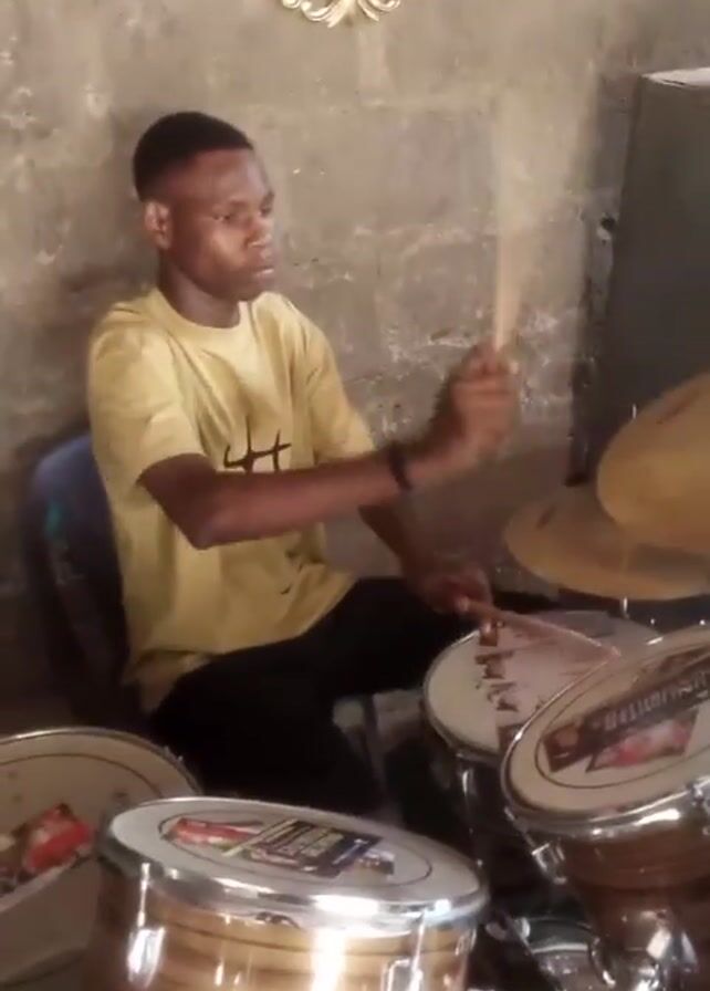 A young man is playing a drum set. He is sitting on a blue plastic chair and wearing a light yellow T-shirt and black pants. He is rhythmically striking the drums and cymbals with drumsticks. The drum set is partially visible with several drums and cymbals arranged around him. The drums have a wood-grain finish. The background is a simple, undecorated room. The walls are a rough, textured grey. A decorative, gold-colored wall hanging is visible above him.