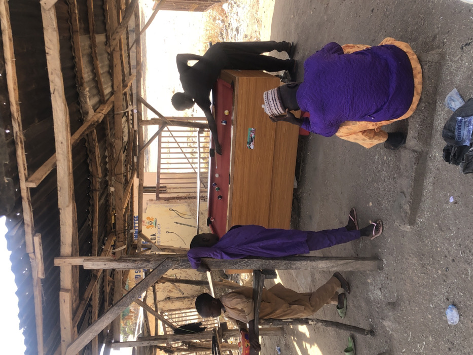In Wai A, Nigeria, an outdoor scene unfolds under a makeshift corrugated metal roof supported by rough wooden posts and beams