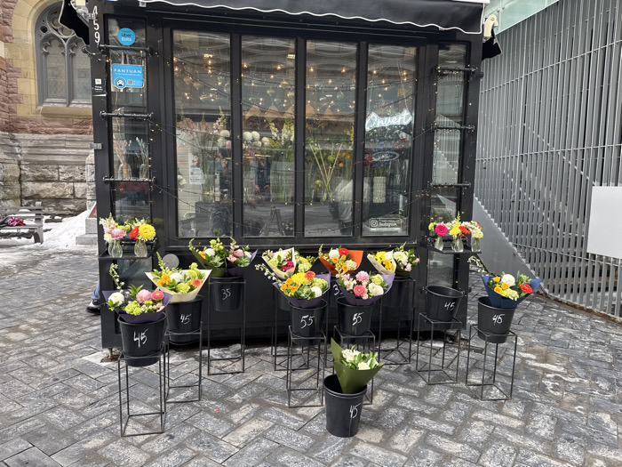 A flower stand displays colorful bouquets in black buckets with price tags of $35, $45, and $55. The stand, framed in black, has a glass display filled with more flowers and string lights. "Ouvert" is visible in the window. The stand is situated on a stone-paved area near a building and a metal fence. Snow patches are visible in the background.