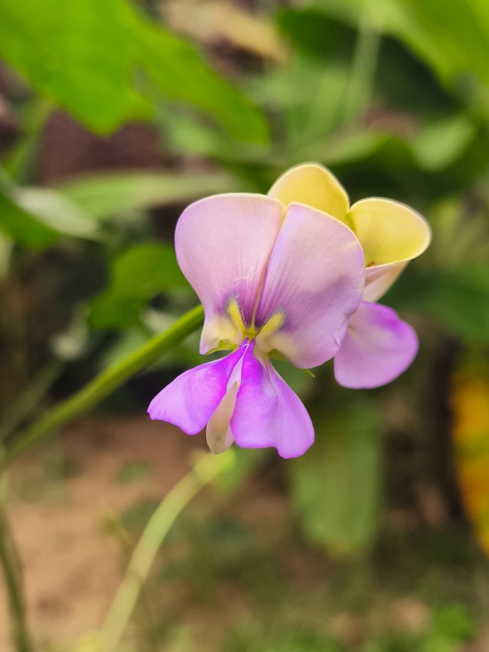 A close-up vertical photograph captures a single pea-like flower, likely from a leguminous plant, situated in Teumpokteungku, Indonesia. The prominent blossom features a light yellow banner petal at the top, two light purple wing petals, and a distinct vibrant magenta keel petal with a small yellow-green central area. The flower is supported by a slender green stem visible on the left side of the frame. The background is heavily blurred, displaying out-of-focus green foliage in the upper portion and a mixture of brown earth and muted green vegetation in the lower half. No individuals or specific actions are depicted.