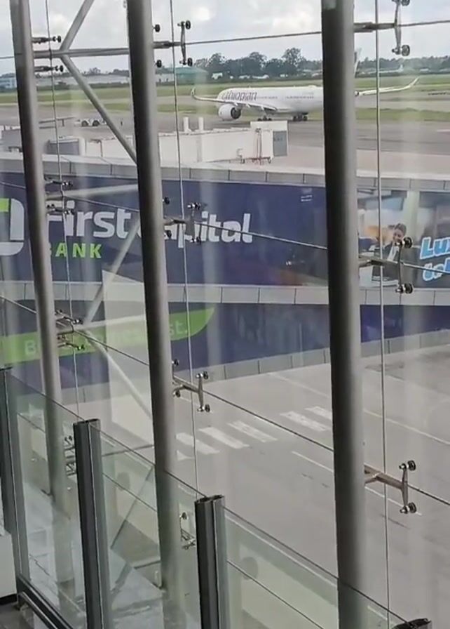 The video depicts an airport scene viewed through a glass partition. An airplane, labeled "Ethiopian," is visible on the tarmac. The glass partition is supported by vertical metal poles, and behind it, an advertisement for "First Capital Bank" is visible. The overall environment suggests an airport terminal or waiting area. There is no discernible human activity within the video frame.