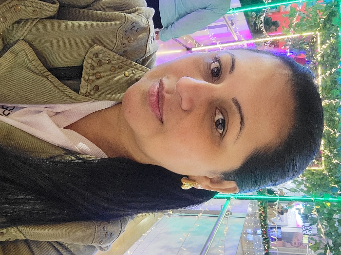 A woman with dark hair and olive skin poses in a mall. She wears a khaki jacket with gold studs. A white t-shirt is visible beneath. Her black hair is pulled back. Gold butterfly earrings adorn her ears. Bright lights, greenery, and festive decorations surround her, including a neon frame and Christmas trees. The mall's bright and airy atmosphere is visible in the background.