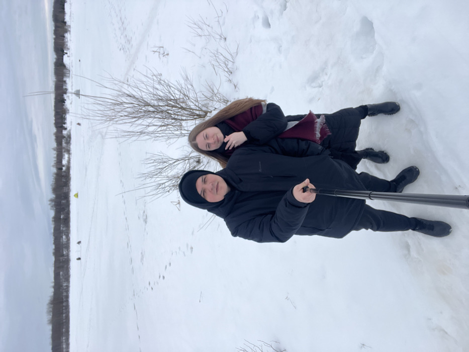 Two individuals, an adult male and an adult female, are visible in the foreground of a snow-covered outdoor environment in Kalinino, Russia