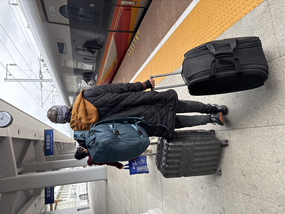 The image depicts a railway station platform at Furongzhen Railway Station in Furong, China, as indicated by bilingual signage on a blue panel. An individual, viewed from behind, is walking left-to-right along a grey paved platform, parallel to a stationary, silver-colored high-speed train with red and orange stripes. This person is wearing a black quilted jacket with an orange hood, grey pants, dark sneakers, and a multi-patterned bandana on their head. They are pulling two pieces of luggage: a black hard-shell rolling suitcase with a textured surface to their left, and a black soft-sided rolling duffel bag with an extended handle to their right. A teal backpack is worn on their back. Behind and to the left of the primary subject, another person is partially visible, also walking and carrying a blue reusable bag displaying white Chinese characters. The platform edge features a yellow tactile warning strip with circular bumps. Overhanging power lines are visible above the train. An analog clock, with a white face and black hands, is mounted on a white support pillar, indicating approximately 1:50. Reflections of individuals and interior elements are discernible in the train's dark windows. The sky appears overcast, providing diffuse lighting.