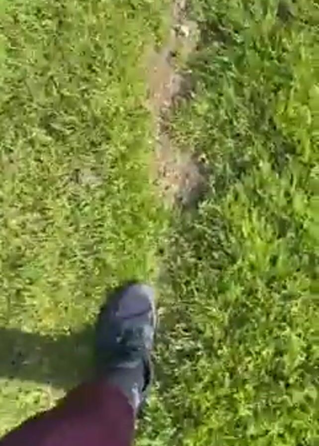 A person walks along a dirt path in a field of green grass. They wear dark-colored athletic shoes, black socks, and maroon pants. The shadow of the person and the phone filming are visible on the ground. The day is sunny.