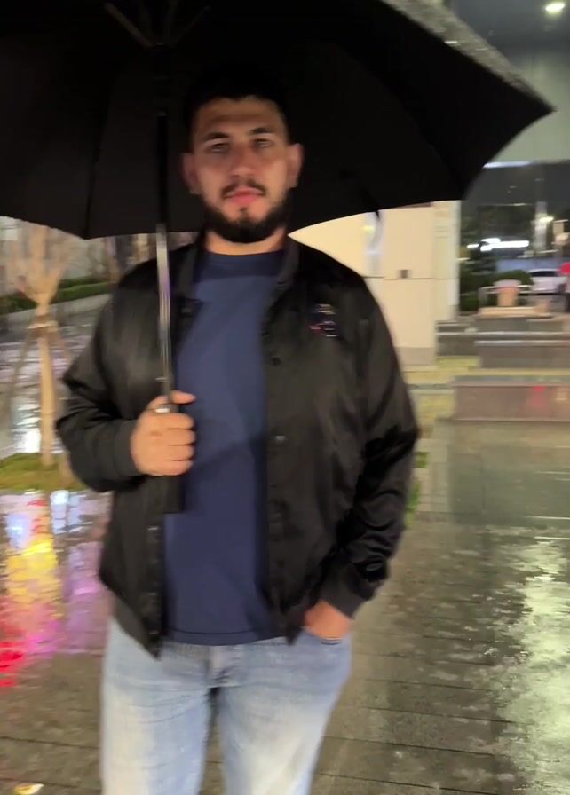 A short video shows people walking on a rainy city sidewalk. In the opening shot, a man stands under a black umbrella, looking at the camera. He wears a black jacket, blue shirt, and jeans. A couple then walks by under the umbrella. The woman has black hair and glasses, wearing a brown jacket with white and yellow stripes. The man beside her wears a green jacket and baseball cap. The camera follows them briefly as they walk down the sidewalk, showing the rainy urban environment.