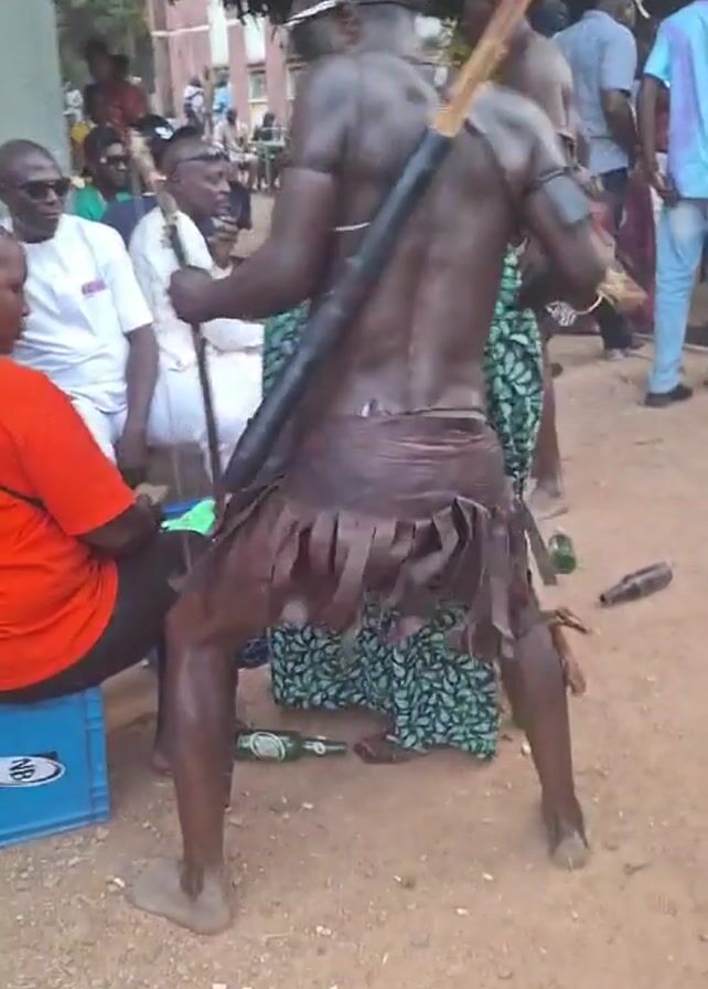 man in what appears to be traditional attire dancing at an outdoor event. He wears a leather fringe skirt, a quiver filled with arrows strapped to his back, and has a bow in his hand. The man is shirtless and has dark skin, and he is wearing a hat. People are watching him dance, and some are seated on a blue plastic crate. A few empty beer bottles are scattered on the ground. The environment appears to be a village or rural setting, with trees visible in the background.