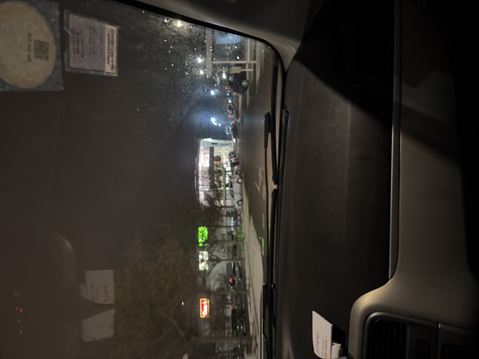 view from inside a car at night, looking out through the windshield towards a street
