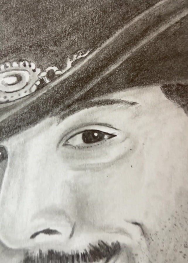 drawing of a man with a cowboy hat, beard, and mustache
