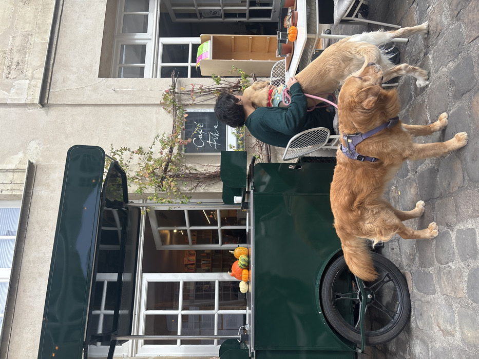 The image displays an outdoor cafe scene on a cobblestone street in Paris, France, identified as Café Fika, located at 12 Rue du Pont Louis-Philippe, 75004. A dark-haired individual in a dark green sweater is seated at a white metal outdoor table, embracing a golden retriever that stands on its hind legs, wearing a pink leash and a patterned collar/bandana. A second golden retriever, wearing a purple harness, stands on all fours in the foreground, facing towards the right side of the frame. To the left, a dark green mobile cart with an awning is present, displaying several small decorative gourds. On the table, a wooden tray holds two dark-colored mugs and an additional small orange gourd. The background features a light-colored, weathered building facade with multiple white-framed glass doors, one of which is open to reveal interior bookshelves. A black chalkboard sign with "Café Fika" written in white chalk is mounted on the wall, partially obscured by vines with green and reddish leaves. The street surface is composed of cobblestones.