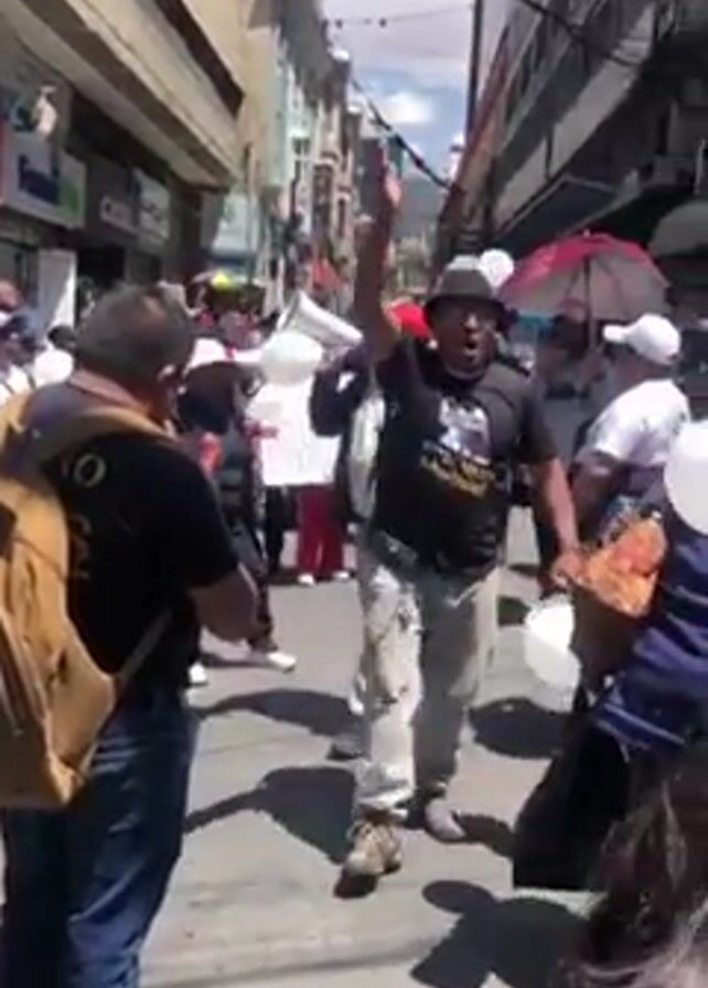 group of people participating in a street demonstration, captured from within the crowd. The environment is an urban setting, characterized by buildings lining both sides of a narrow street. Individuals are holding white balloons and signs, indicating a protest or march. Several persons are carrying bags or backpacks. The person in the foreground is wearing a black t-shirt with a graphic print and a black hat. He is speaking or chanting, and motioning with his hands to amplify the message. The crowd is walking along the street. The overall atmosphere indicates a gathering with a specific purpose, likely related to demanding justice, as the chant suggests.