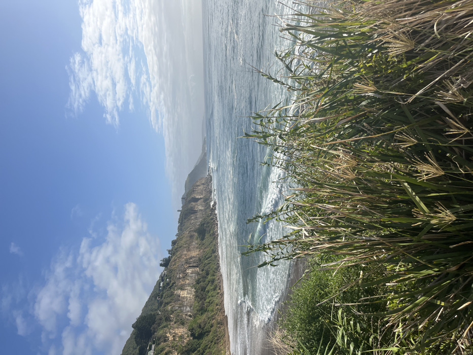 From an elevated perspective, the photograph captures a landscape where the ocean meets a rugged coastline. The sea is active with visible waves, and the sky above is dotted with clouds, creating a sense of expansive space. On the right, tall grasses and foliage fill the foreground. The landmass features rocky cliffs and vegetation, leading to a beach area where the water breaks. Overall, the scene evokes a sense of natural beauty and coastal terrain.