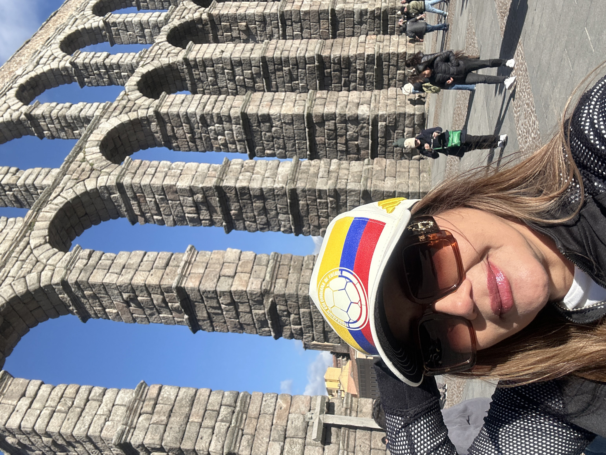 woman taking a selfie at the Roman Aqueduct of Segovia, Spain. The aqueduct is made of large granite blocks without mortar. The woman wears sunglasses and a hat with the colors of the Colombian flag. Several other people are walking in the background. The sky is blue.