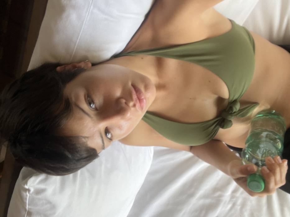 A young adult female is depicted lying on white bedding indoors, likely a bedroom setting. The background consists of white pillows and sheets, with a dark, possibly wooden, surface partially visible at the top left. No discernible features in the image indicate the specific location of Faro de José Ignacio, Uruguay. The subject has short, dark hair and wears an olive green halter-neck bikini top with a knot tied at the center front. She holds a clear plastic water bottle with a green screw cap in her left hand, resting it on her lower abdomen. Her gaze is directed forward, towards the camera.