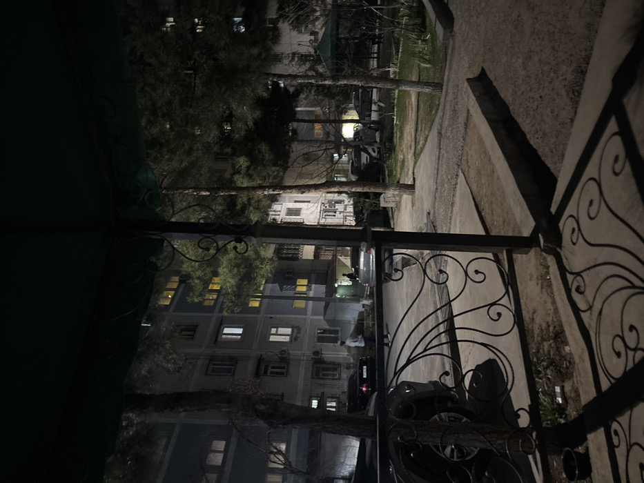 An apartment building at night, seen through an ornate wrought iron fence. Windows illuminate some apartments, while others remain dark. Trees partially obscure the view of the building and the street beyond. Several cars are parked along the street. The scene is mostly dark, with only a few areas lit by streetlights or building illumination.