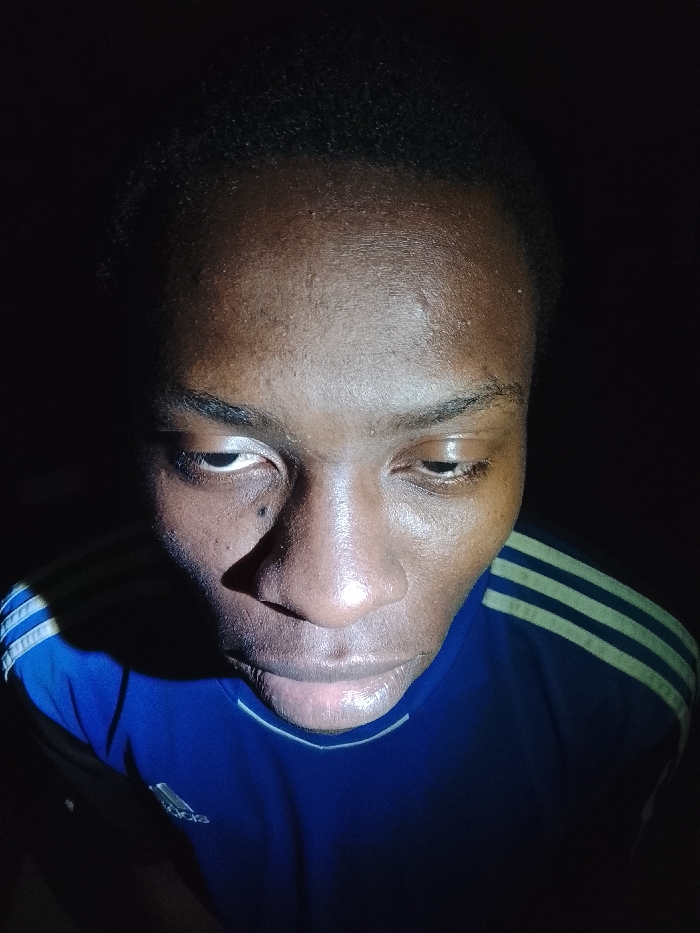 A low-angle portrait of a person with dark skin and short hair. The individual is wearing a blue shirt with white stripes on the shoulder. A small mole is visible near one eye. The face is illuminated by a light source above, creating dramatic shadows. The person's eyes are cast downward, giving a pensive expression. The background is dark, emphasizing the lit features of the face.