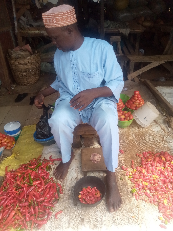 An adult male is observed seated on a low wooden stool in what appears to be a market stall in Kafanchan B, Nigeria. He wears a light blue traditional tunic with embroidered detailing and a light pink patterned cap, and is barefoot. His gaze is directed downwards and to his left. His right hand manipulates the contents of a black plastic bag situated within a blue plastic bowl positioned to his left. The ground is covered with a yellow mat on his left and a lighter-colored tarp on his right, strewn with light brown debris. Piles of produce surround him: a large quantity of red chili peppers mixed with some green ones rests on the yellow mat to his left. To his right, on the lighter tarp, is a large pile of smaller, rounded red peppers, with a black bowl containing a smaller portion of these peppers positioned between his bare feet. Behind him to his right are multiple green plastic bowls containing neatly piled red plum tomatoes, alongside an inverted white plastic bucket. A small wooden block with a reddish-brown object rests between his feet. In the background, wooden shelving and structures suggest a market environment, with a woven basket and black sandals visible on the left.