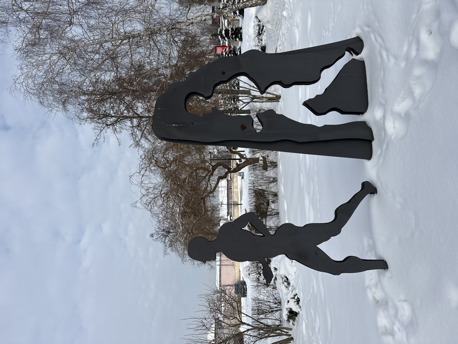 The image depicts two dark metallic sculptures situated in a snow-covered public space in Irpin, Ukraine, specifically identified as part of the "Road to Life" memorial in Heroes' Alley