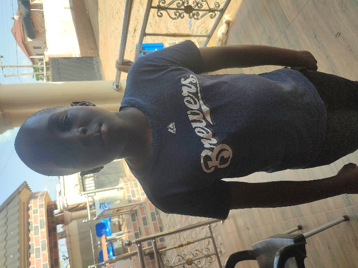 A young male individual with a dark complexion and short, buzzed hair stands centrally in the image, facing directly forward