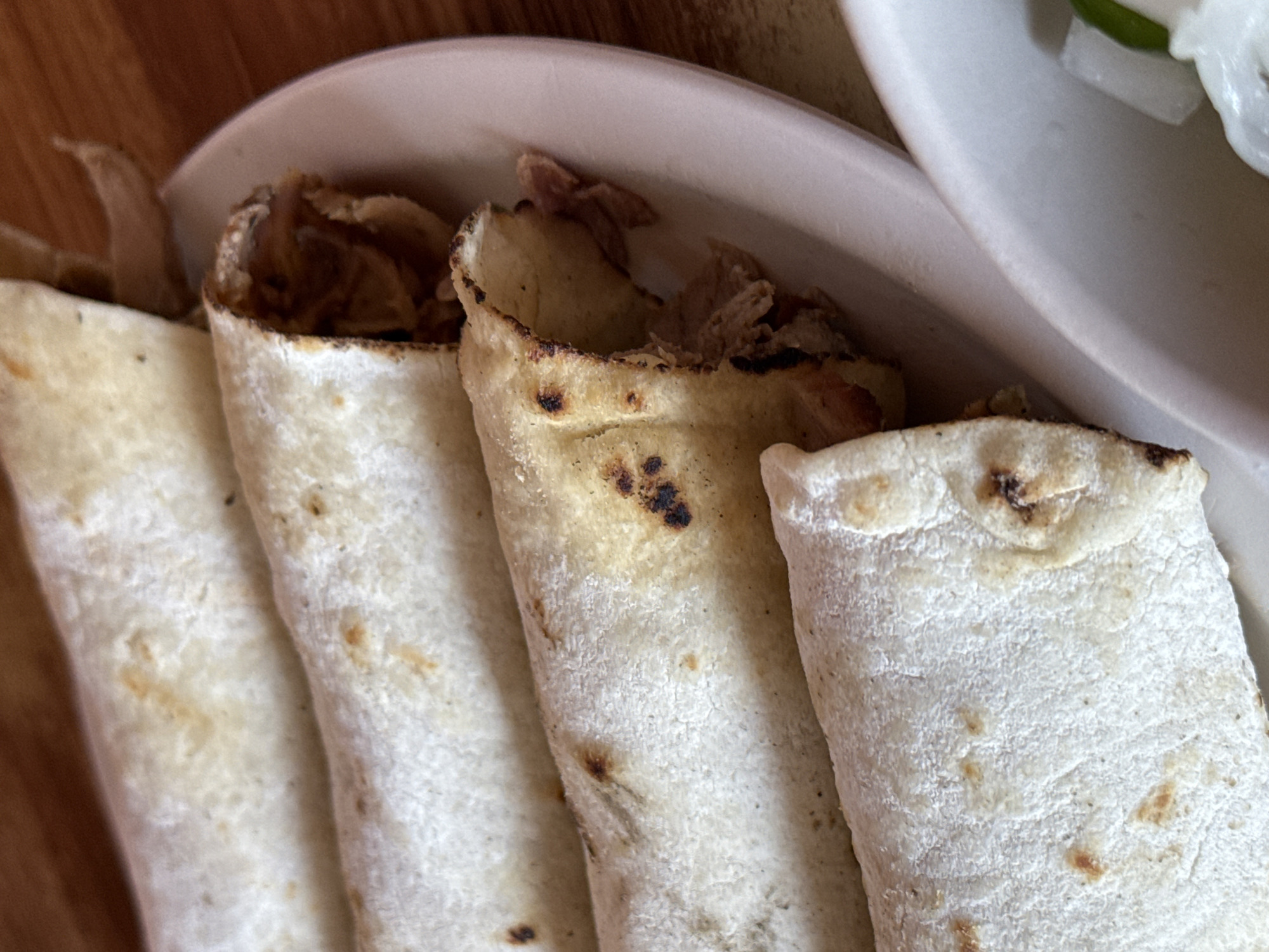 - "The image displays a close-up, high-angle view of four rolled food items, identified as taquitos or flautas, arranged diagonally on a light-colored, possibly off-white, ceramic plate" by FM-BAhUf2, licensed under CC BY 4.0
