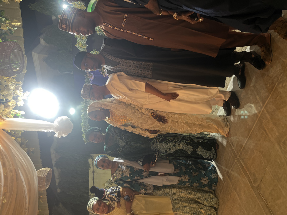 A group of seven individuals pose for a photo at an event. Four men at the top wear traditional attire, including caps and long robes. The three women below also wear traditional dresses. The lighting is bright, and some decorations like white flowers and woven baskets are visible in the background.