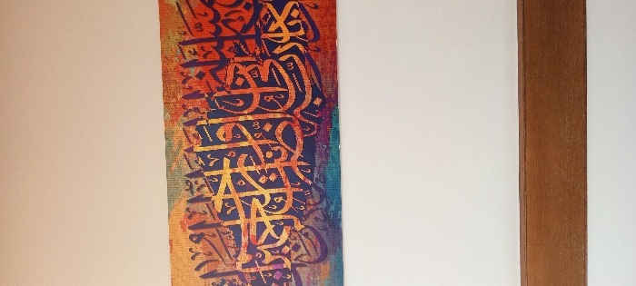 The image depicts an interior wall scene, likely located within an unspecified building in Fez, Morocco. The central subject is a rectangular piece of wall art featuring vibrant Arabic calligraphy. The calligraphy is rendered in dark blue and purple tones with yellow and gold accents, against a multi-colored background that transitions through shades of orange, red, blue, purple, and yellow. The texture of the artwork suggests it is either a tapestry or a print on a textured canvas. The artwork is horizontally oriented and occupies the upper-middle portion of the frame. Below the artwork, a light-colored wall extends downwards, interrupted by a horizontal, light brown wooden trim or dado rail. No individuals, actions, or interactions are visible within the frame. The environment is minimalistic, focusing on the artwork and architectural details of a wall.