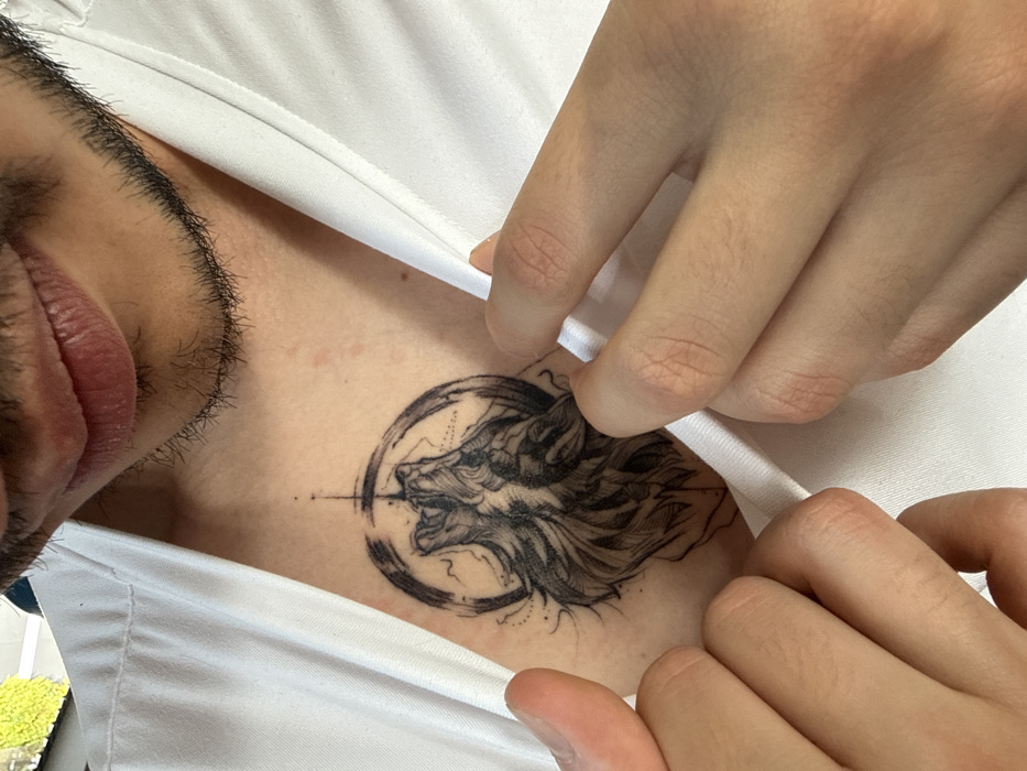 A close-up image taken in Perimetro Urbano Pereira, Colombia, depicts the upper torso of an individual. The subject's lower face, including the chin with visible stubble and slightly parted lips, is present at the top of the frame. Two hands, with light skin tone and visible knuckles, are shown actively pulling open a white shirt, exposing the upper chest. Centered on the sternum is a black and grey tattoo featuring a stylized wolf's head depicted mid-howl, facing upwards. The wolf design is encircled by a thick, broken black ring, from which abstract lines and dots extend upwards, forming a compass-like or celestial element above the wolf. The background is out of focus, suggesting an indoor environment with indistinct light-colored features.