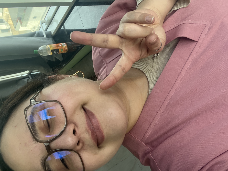 The image captures a close-up, chest-up selfie of an adult female in an indoor setting. She has dark hair and is wearing brown, square-framed eyeglasses, with blue light reflections visible on the lenses. Her left eye is closed in a wink, and her lips are curved upward in a smile. She wears a light pink V-neck uniform top, likely scrubs, over a light beige ribbed long-sleeved shirt. Gold-colored twisted hoop earrings are visible on both ears. Her right hand is raised, with the index and middle fingers extended to form a peace sign. A plain silver-colored ring is present on her right ring finger, and a silver chain necklace with a small pendant is visible around her neck. In the background, behind the subject's right shoulder, a large window provides a view of an urban environment from an elevated position. On the interior windowsill, a plastic bottle of orange-labeled "Dalys" brand juice and a white electrical outlet are visible. The exterior view through the window shows light-colored building facades. The presence of the "Dalys" brand juice, popular in Morocco, and the urban architecture indicate the location is a building within the city of Casablanca, Morocco.